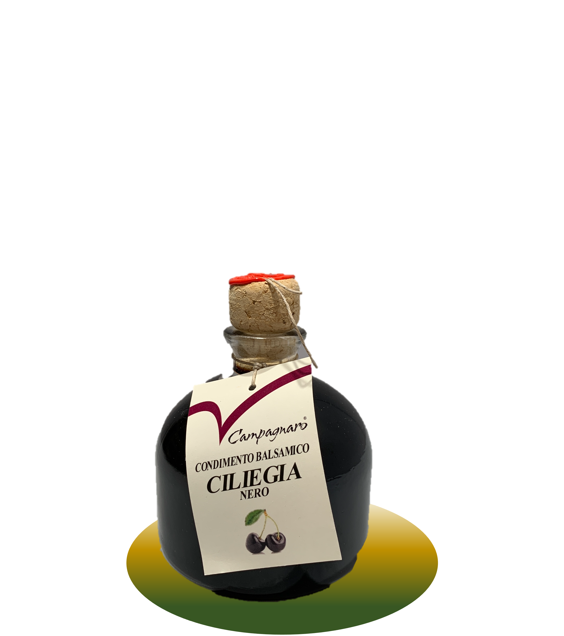 Condimento Balsamico al gusto di Ciliegia Nero. Ideale da abbinare a formaggi, condire insalate e sbizzarrirsi davanti ai fornelli.
